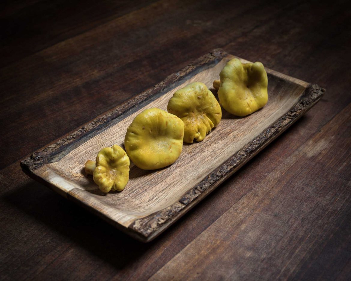 The golden yellow mushroom has a fruity aroma, a firm thick overall appearance and white flesh on the inside. During cooking the mushroom gets a chewy texture and the aroma changes to an earthy flavour with a spicy note. With the exception of drying chanterelles are suitable for almost all sorts of processing.e